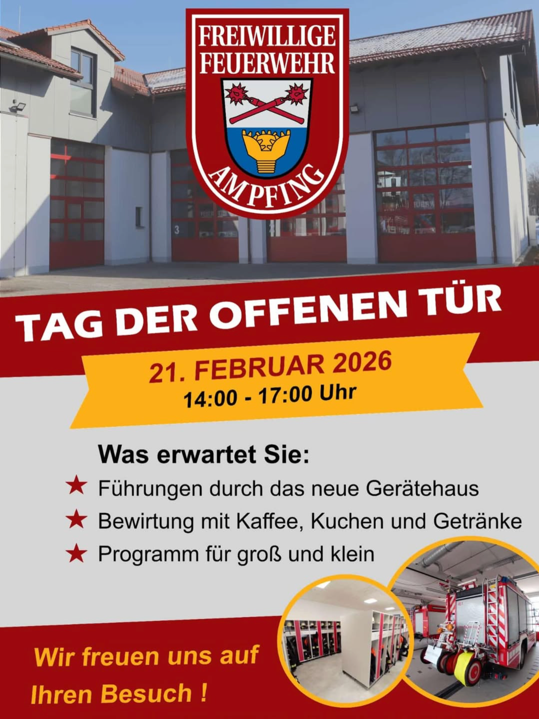 Am Tag der offenen Tür lädt die Freiwillige Feuerwehr Ampfing alle Bürgerinnen und Bürger ein, das neue Gebäude kennenzulernen. Am Samstag, 21. Februar, von 14:00 bis 17:00 Uhr in der St.-Christophorus-Straße 22. Vor Ort informieren ehrenamtliche Kräfte über den erweiterten Standort, zeigen Einsatzeinrichtungen und beantworten Fragen rund um Training, Einsatzbereitschaft und Sicherheitskonzepte.